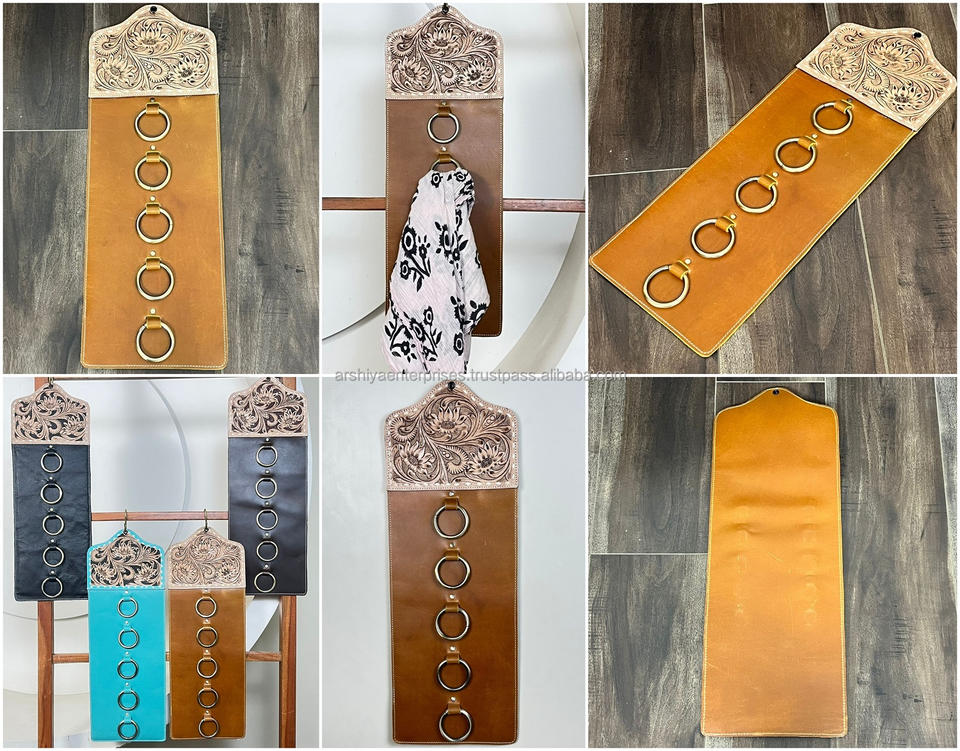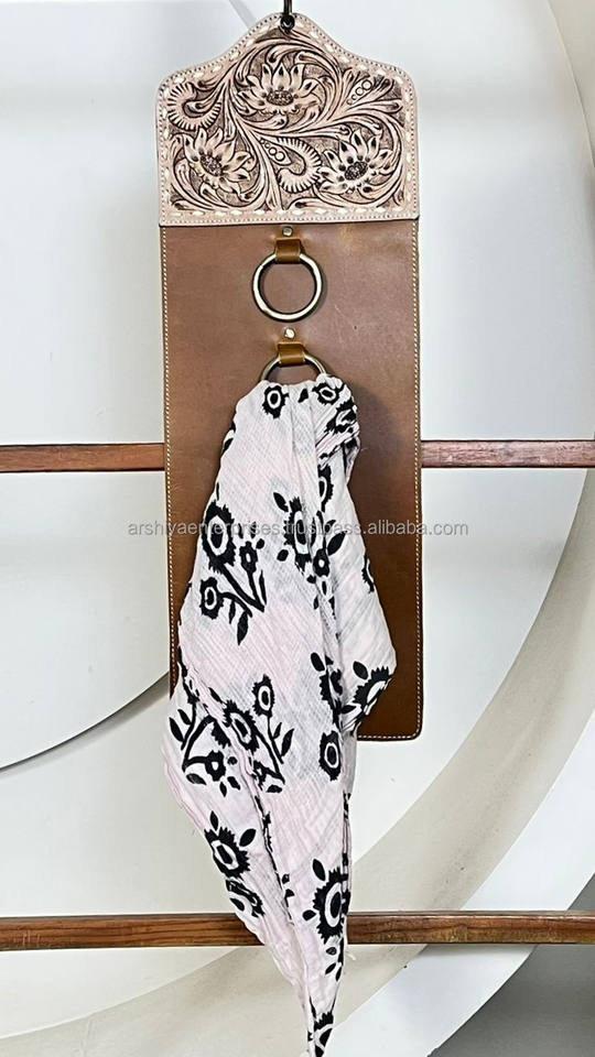 Support de foulard en cuir de vachette fait main et gravé à la main avec motif floral et anneaux métalliques robustes pour la maison, le grange et la décoration western
