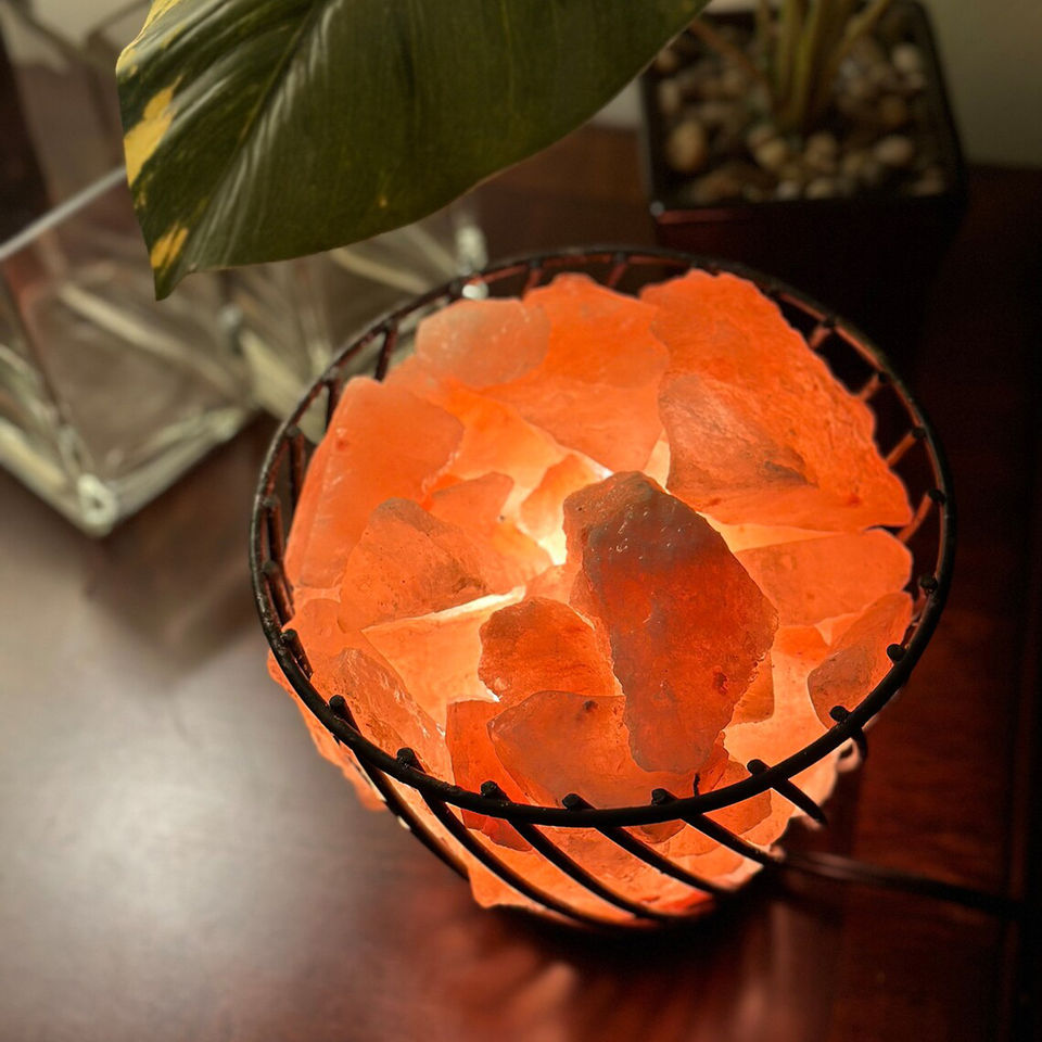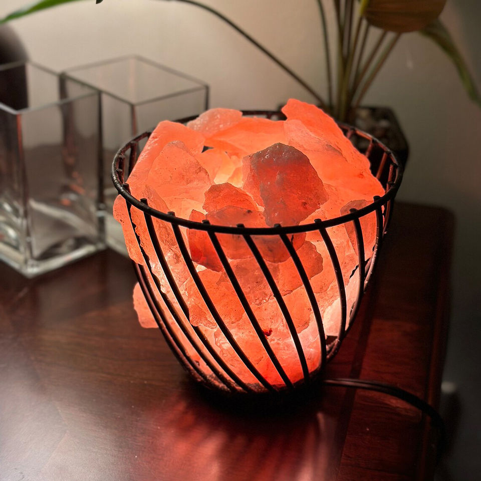 Lampes artisanales au sel gemme de l'Himalaya avec panier en métal ivoire et fer Design artisanal naturel Prix de gros inclus