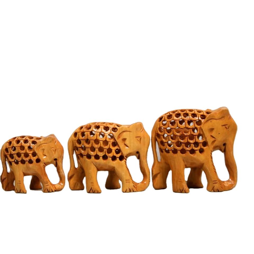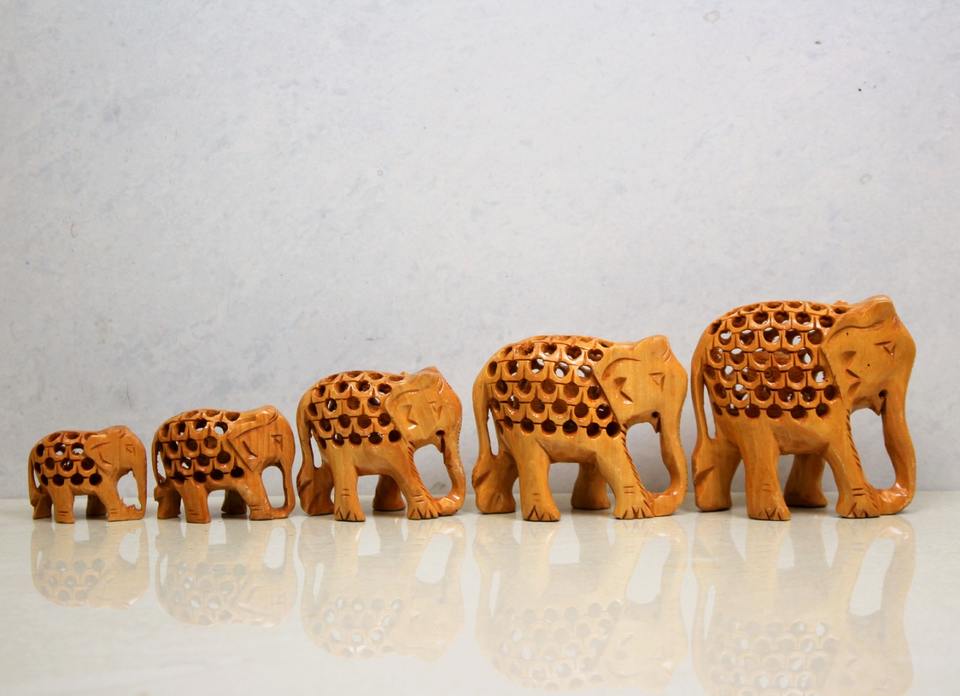 Ensemble de 5 éléphants en bois sculptés à la main avec technique Jaali, statues décoratives traditionnelles indiennes Vastu pour la décoration intérieure