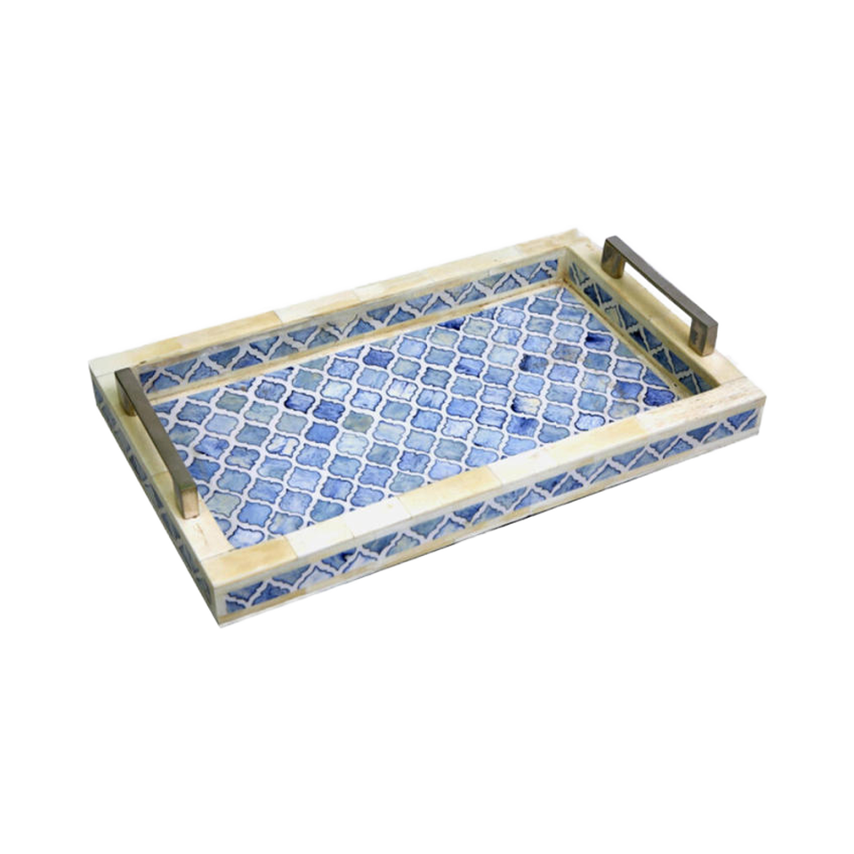 Plateau de service luxueux en résine bleue artisanale avec motif géométrique moderne en nid d'abeille et poignées en métal, décoration rectangulaire