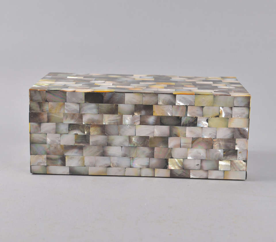 Boîte décorative artisanale de luxe en nacre irisée foncée, incrustation de coquille noire scintillante, mosaïque rectangulaire, boîte à souvenirs