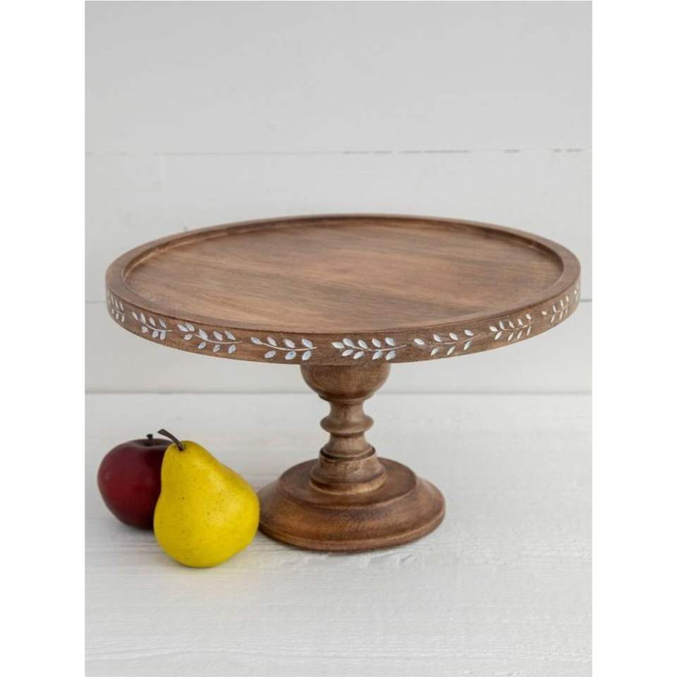 Support à gâteau artisanal en bois de manguier - Présentoir à dessert rustique sur piédestal avec incrustation de feuilles en émail blanc - Plateau à gâteau rond en bois