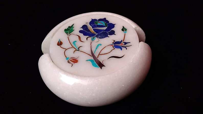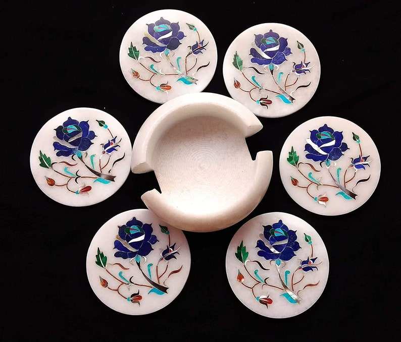 Ensemble de sous-verres en marbre artisanal avec incrustation de pierres semi-précieuses, style royal moghol Pietra Dura, décoration d'intérieur