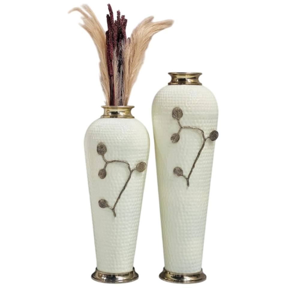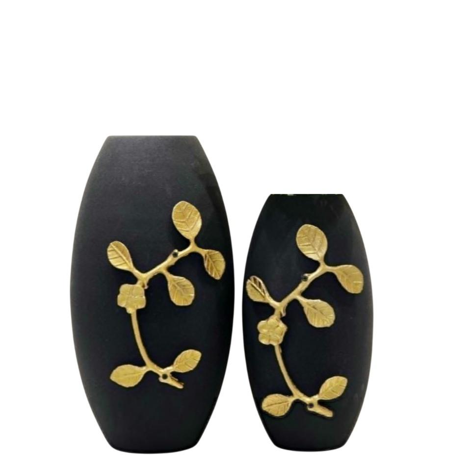 Handcrafted Matte Black Metal Flower Vase Set With Golden Leaf Design Modern Decorative Tabletop Iron Vase For Office Decor
