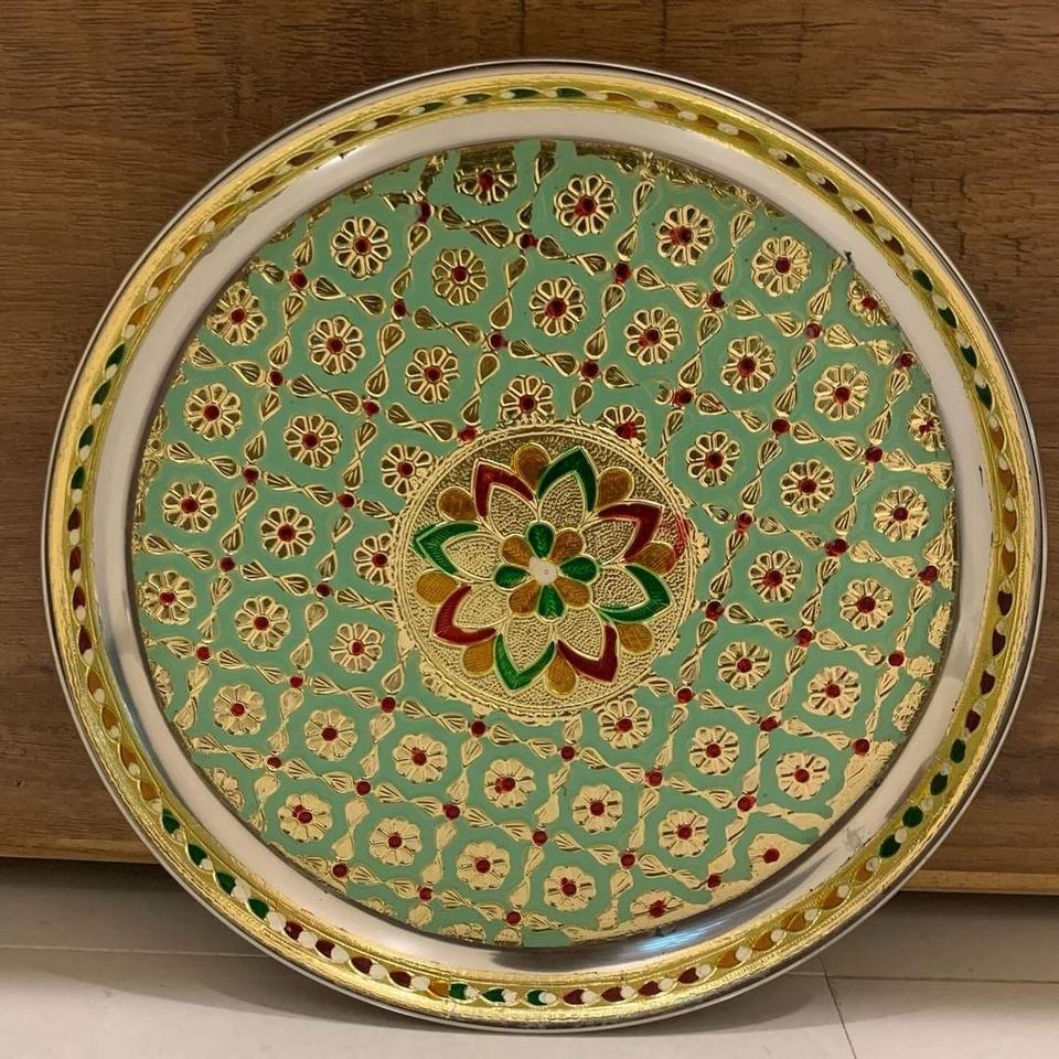 Handcrafted Mint Green Floral Decorative Metal Plate Intricate Gold Detailing and Traditional Indian Art Motifs New Arrival