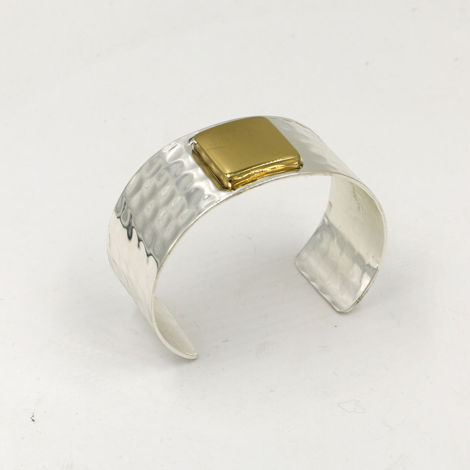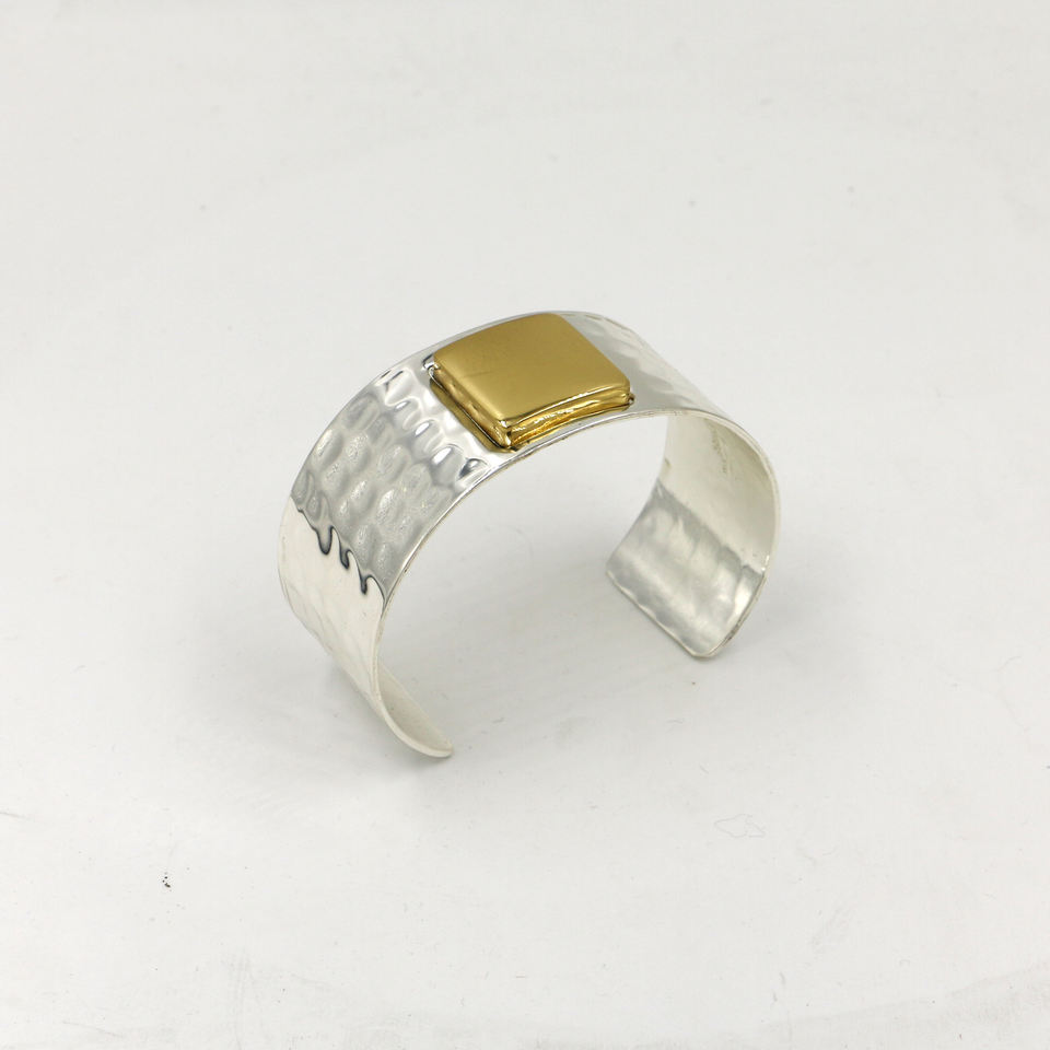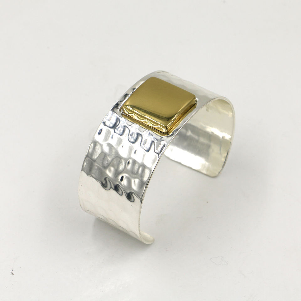 Bracelet manchette artisanal en laiton et métaux mélangés, martelé, large, bicolore, bijou statement, cadeau bohème pour elle