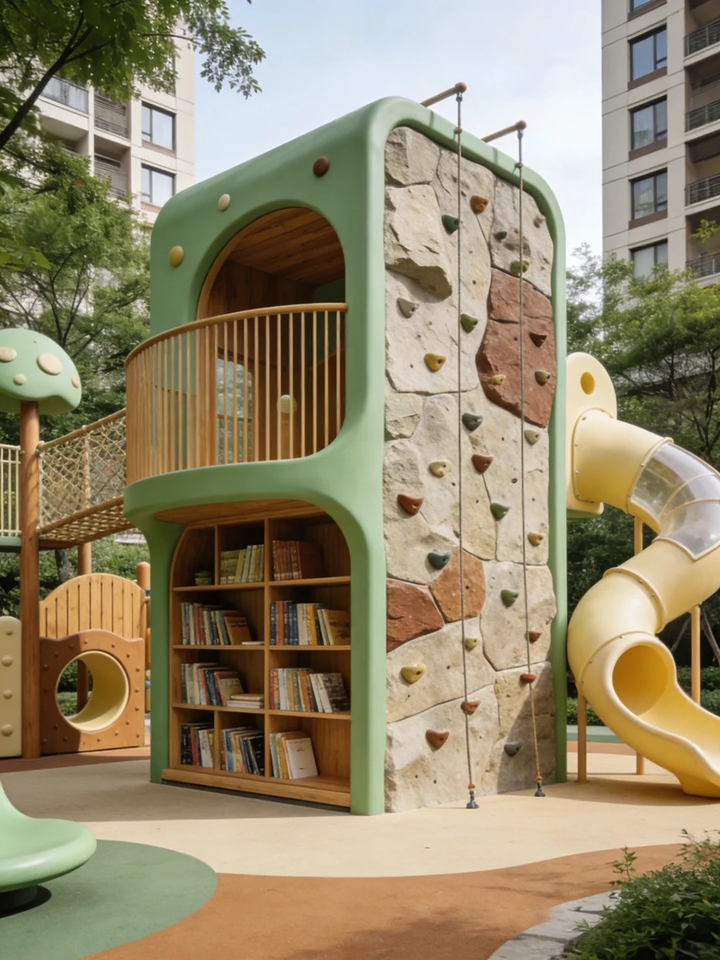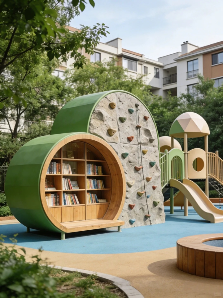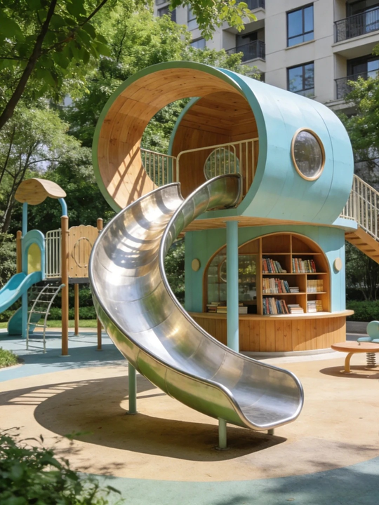 Équipement de terrain de jeu extérieur sur le thème de la bibliothèque, personnalisé, en forme de cylindre, en acier inoxydable, artisanat métallique pour enfants