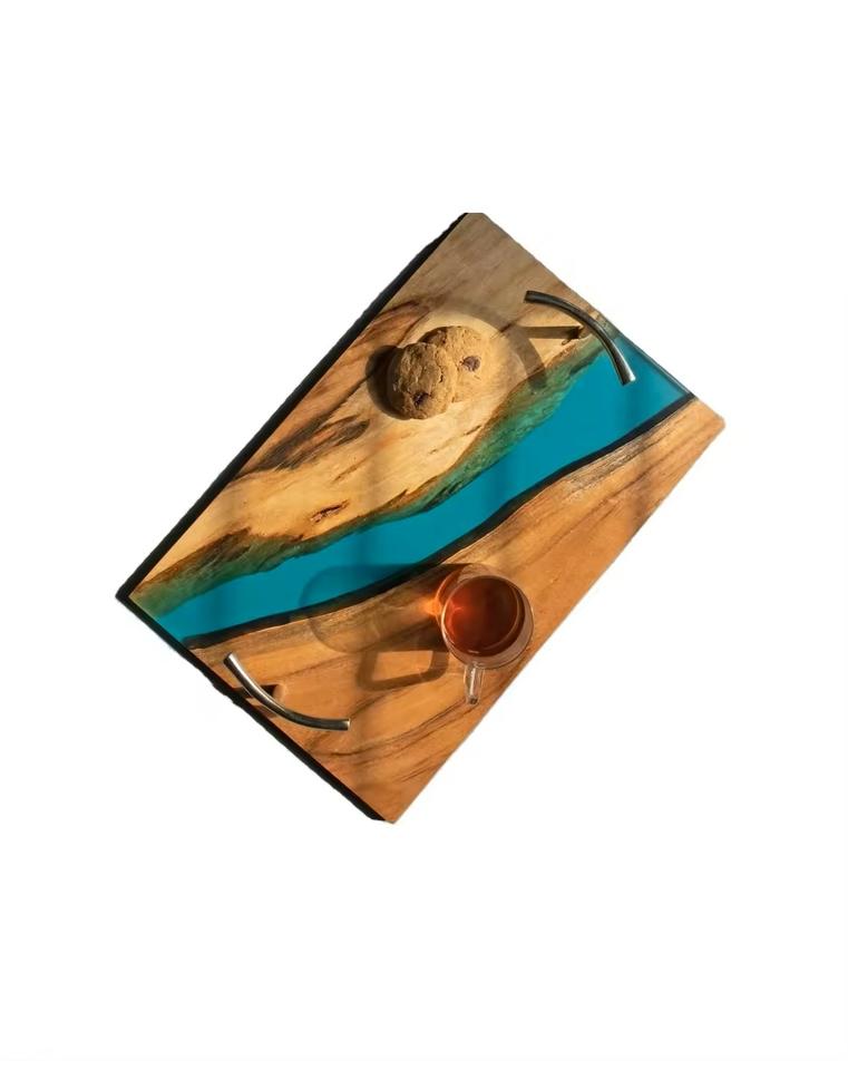 Plateau de service multifonctionnel en bois et résine époxy, fait main, design moderne, avec poignées, plateau décoratif pour charcuterie, pour la cuisine et la salle à manger