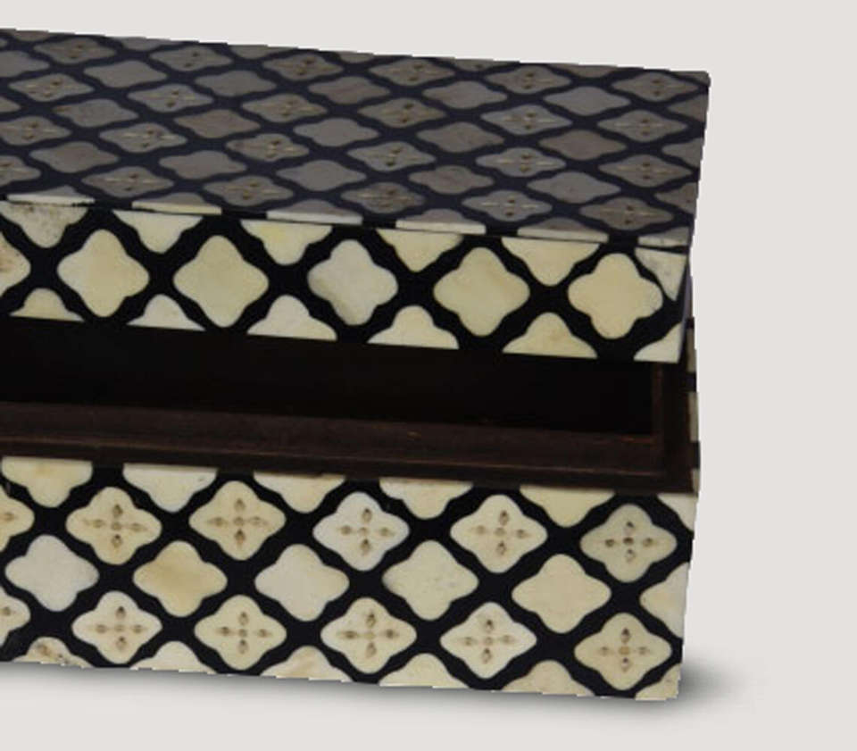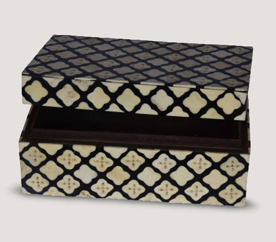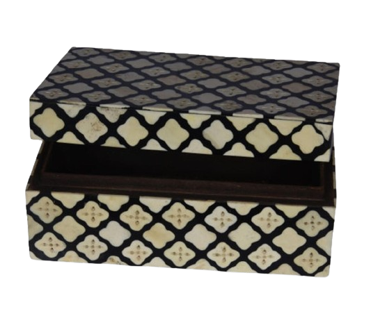 Boîte décorative marocaine artisanale en os incrusté, luxe noir et blanc, motif quadrifoliaire, pour bijoux et souvenirs, idéale pour la maison moderne