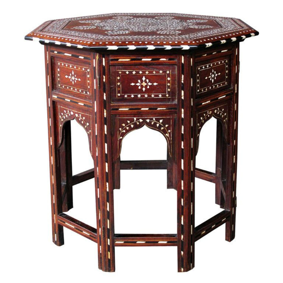 Table d'appoint octogonale en bois de style marocain, fabriquée à la main, avec incrustation de nacre, finition antique, meuble d'appoint islamique maure