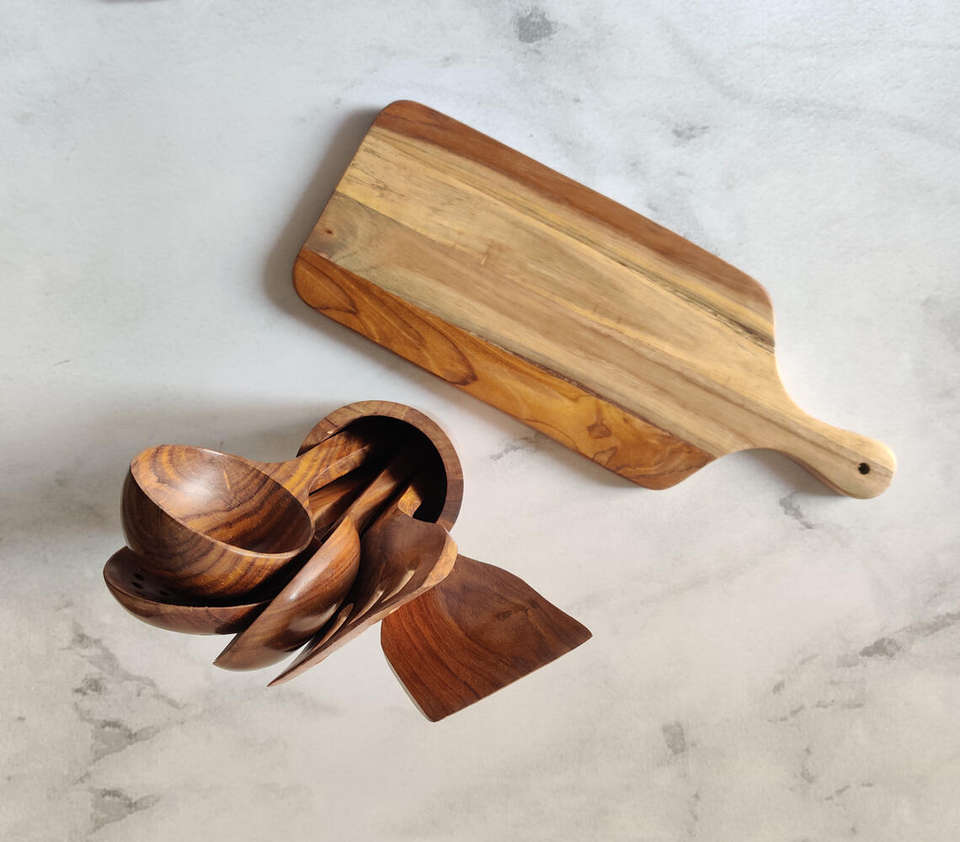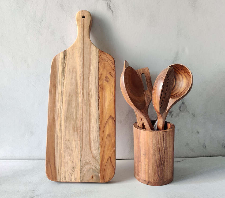 Ensemble d'ustensiles de cuisine en bois naturel artisanal avec grande planche à découper, spatule en bois massif, louche, écumoire et support de rangement