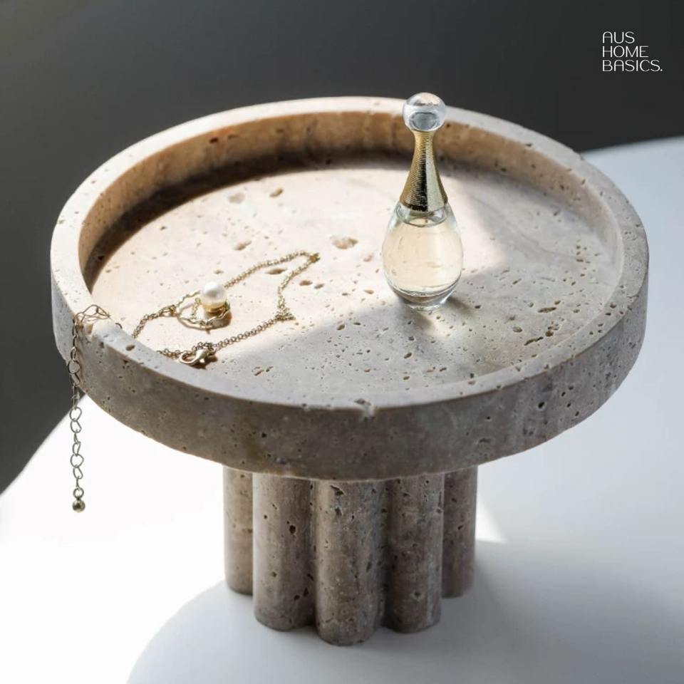 Bol en pierre de travertin naturel artisanal avec base en bois massif, bol à fruits de qualité supérieure, centre de table décoratif pour un intérieur moderne
