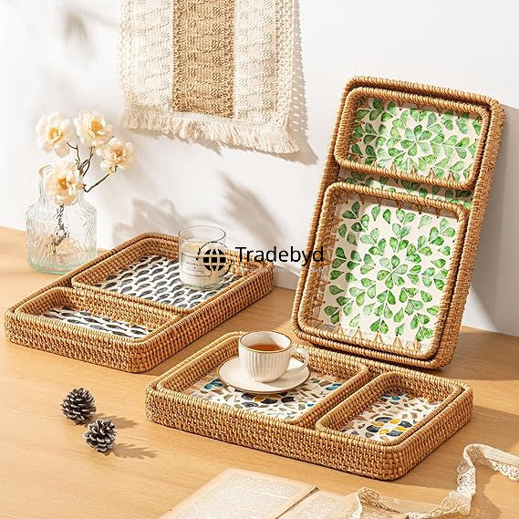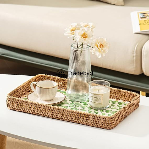 Plateau de service en rotin moderne de qualité supérieure, fait à la main, mobile, élégant, organisateur de maison, Tradebyd