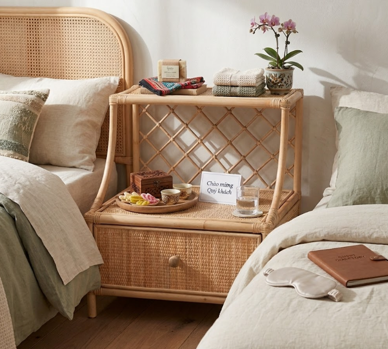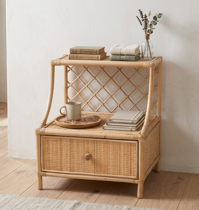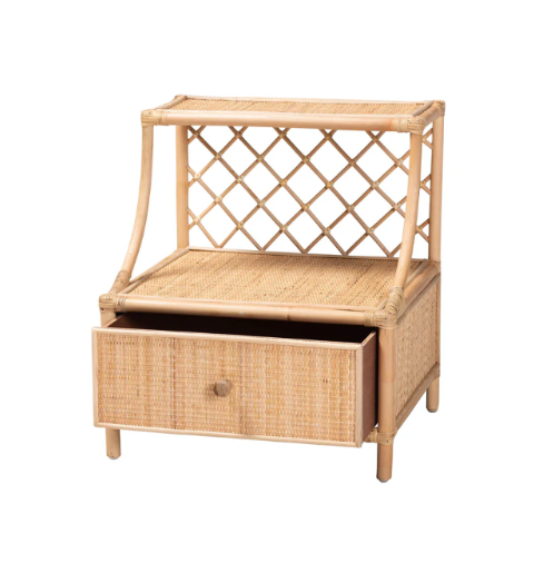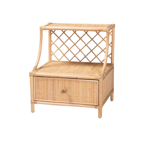 Table de chevet artisanale en rotin avec tiroir et dossier en treillis, étagère de rangement naturelle style bohème, meuble de style bohème fabriqué au Vietnam