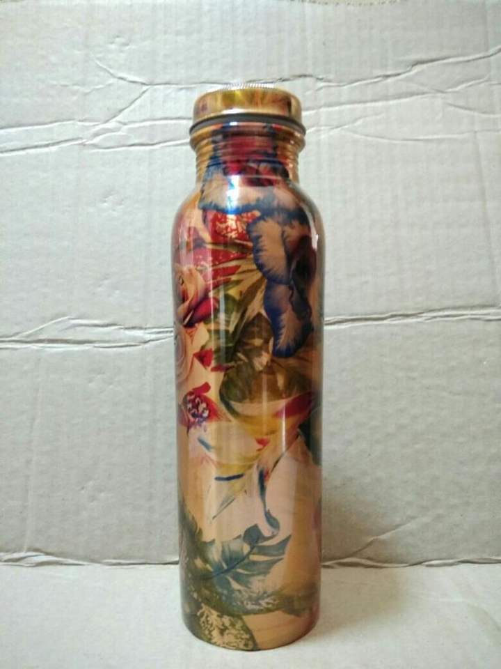 Bouteille d'eau artisanale en cuivre pur, imprimée de motifs floraux rouges, pour le yoga, la gym, le bien-être, les sports, anti-fuite, en métal laqué.