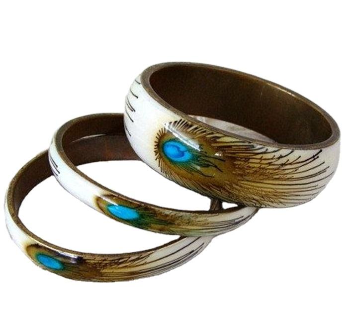 Ensemble de bracelets en résine et laiton fabriqués à la main avec impression de plumes de paon Style Boho bijoux de mode artistique pour femmes et vêtements de fête