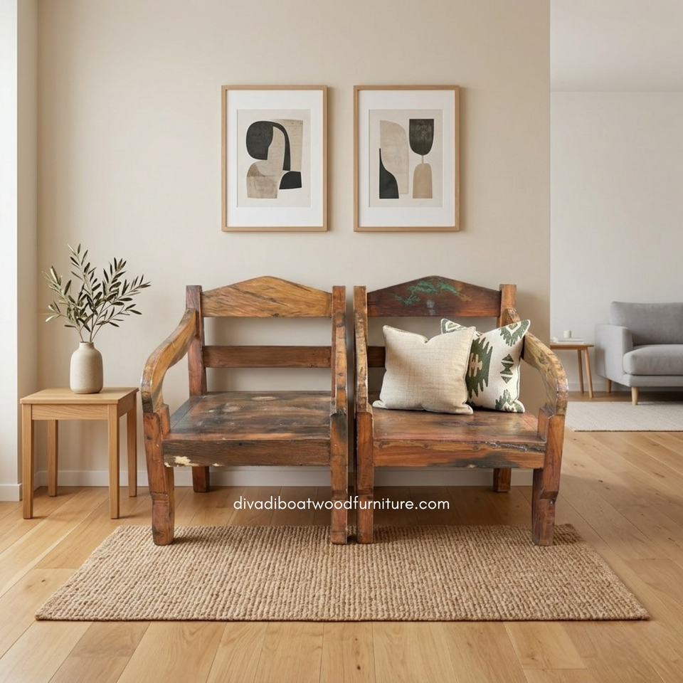 Canapé d'angle rustique artisanal une place avec accoudoir carré en bois de bateau recyclé naturel, démontable, écologique, intérieur/extérieur