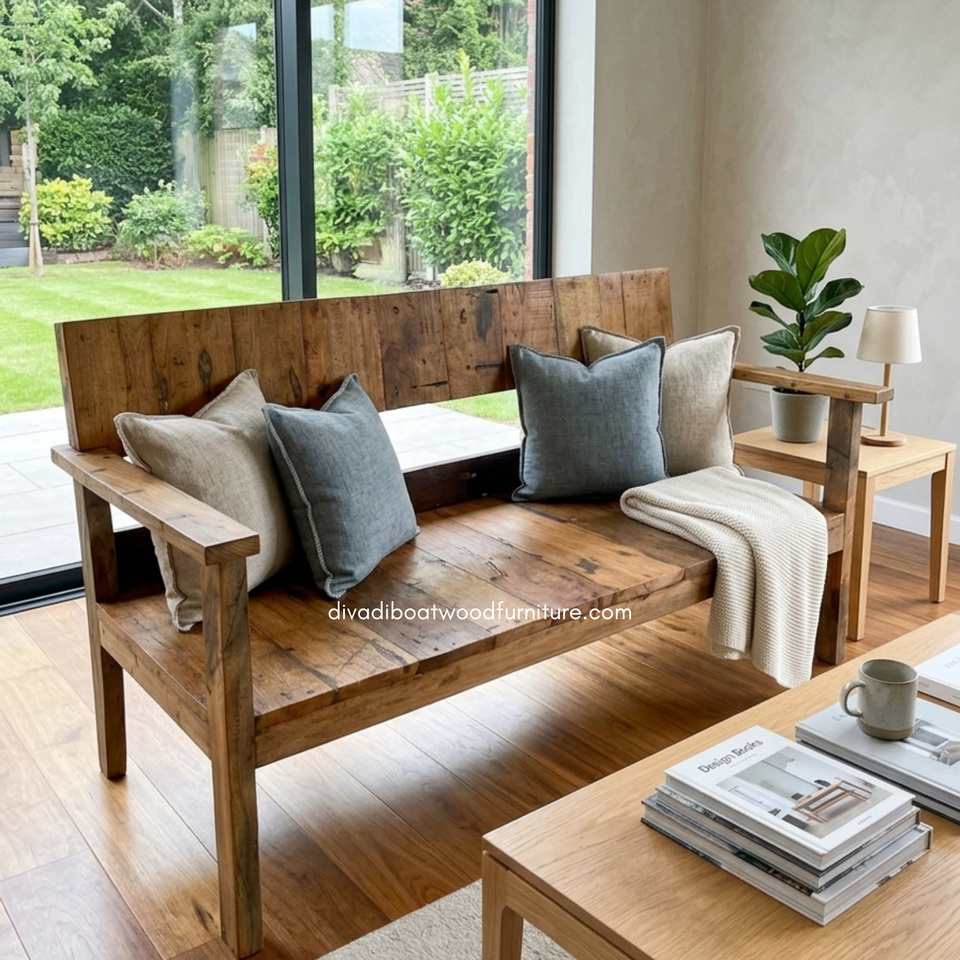 Canapé long rustique artisanal en bois de bateau recyclé, démontable, couleur naturelle, écologique, pour intérieur/extérieur, hôtel, maison, villa