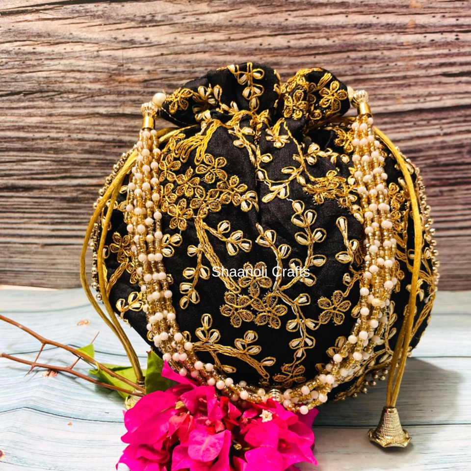Sacs Potli Rajasthani en satin brodé à la main avec des motifs dorés, des pochettes à cordon, des sacs cadeaux avec un design en travail de Gota Patti