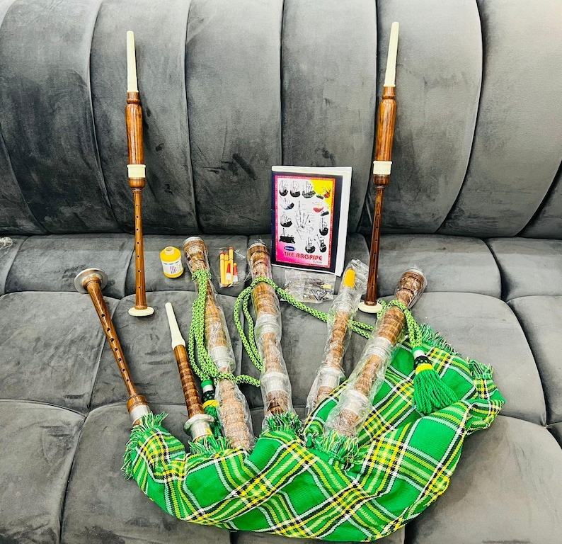Cornemuse écossaise artisanale avec détails argentés et sélection de tartans personnalisés