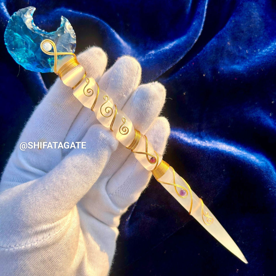 Fabriqué à la main sélénite bleu opalite baguette magique poli fil Wrap Technique énergie guérison Feng Shui pilier cristal pierre artisanat