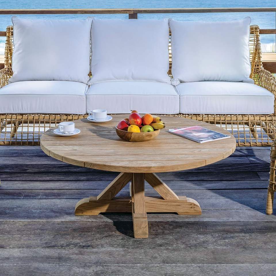 Table basse ronde moderne en teck massif artisanal, finition naturelle écologique, mobilier de salon durable, Indonésie