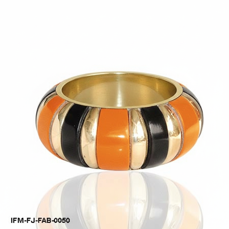 Bracelet manchette artisanal audacieux en résine rayée orange, noire et dorée, bijou bohème épais pour femme