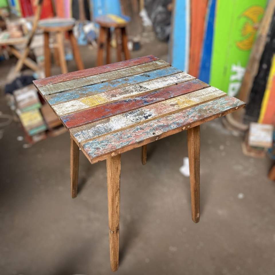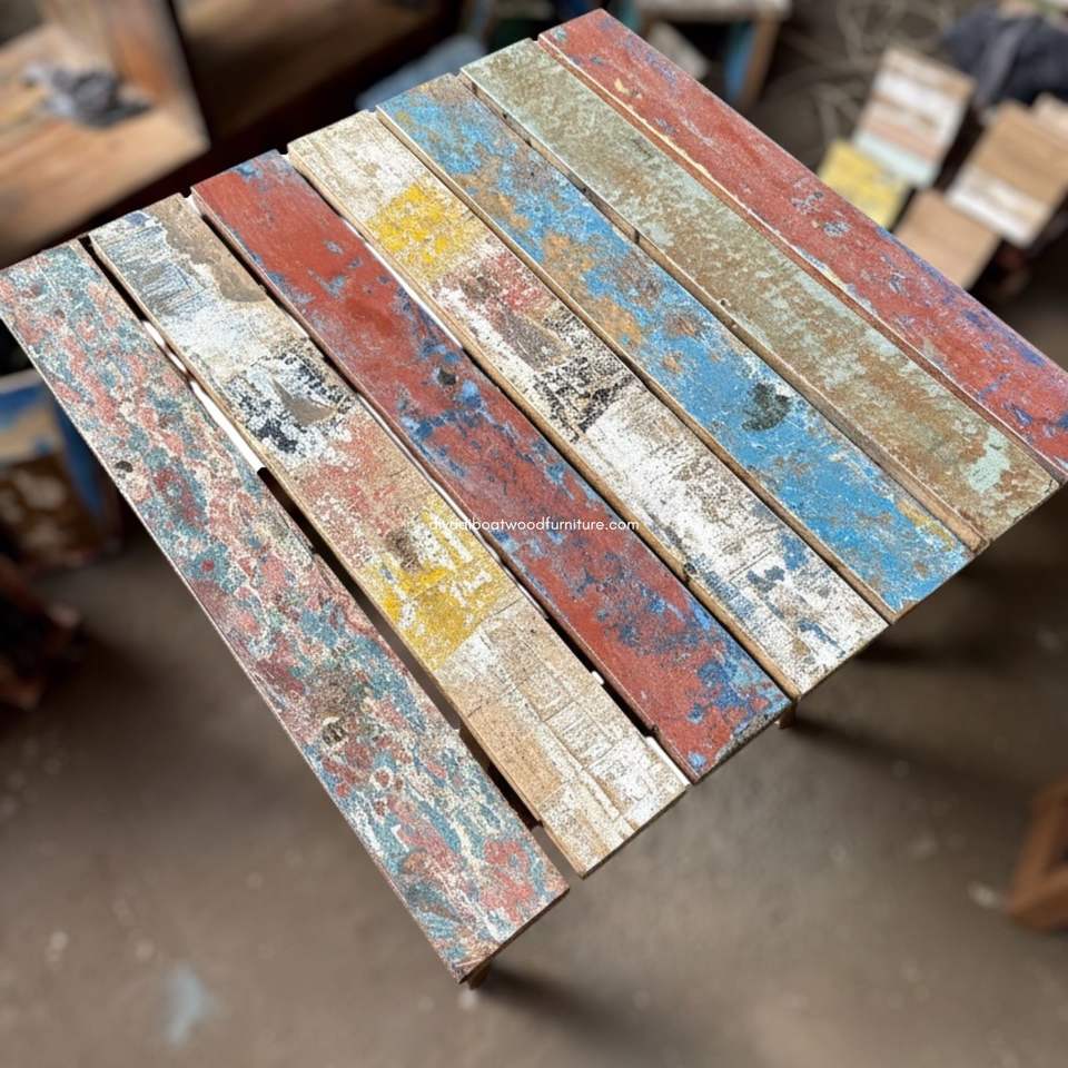 Table carrée artisanale avec espace de rangement et structure démontable en bois de bateau recyclé couleur naturelle pour mobilier d'extérieur, maison et jardin