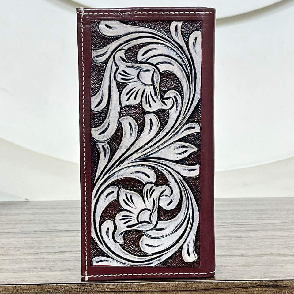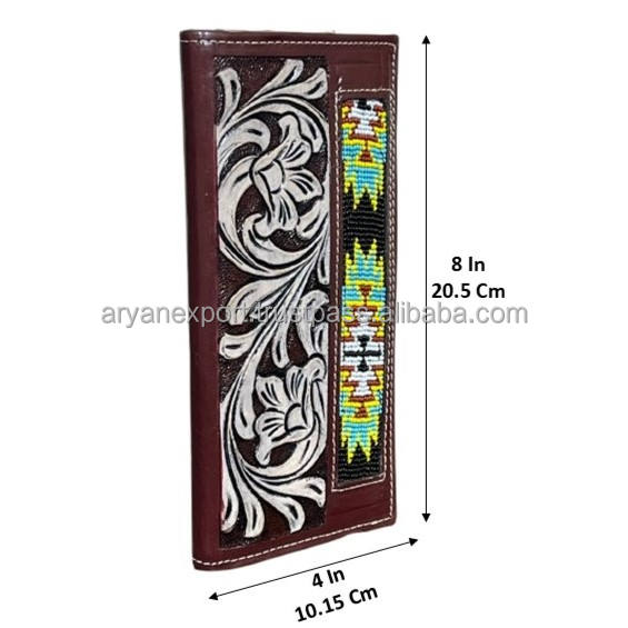 Portefeuille en cuir artisanal avec motif perlé, fin, à double rabat, plusieurs emplacements pour cartes, fenêtre d'identité et compartiment pour argent, pour homme
