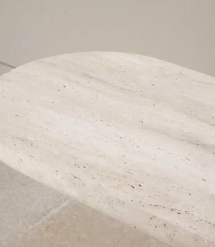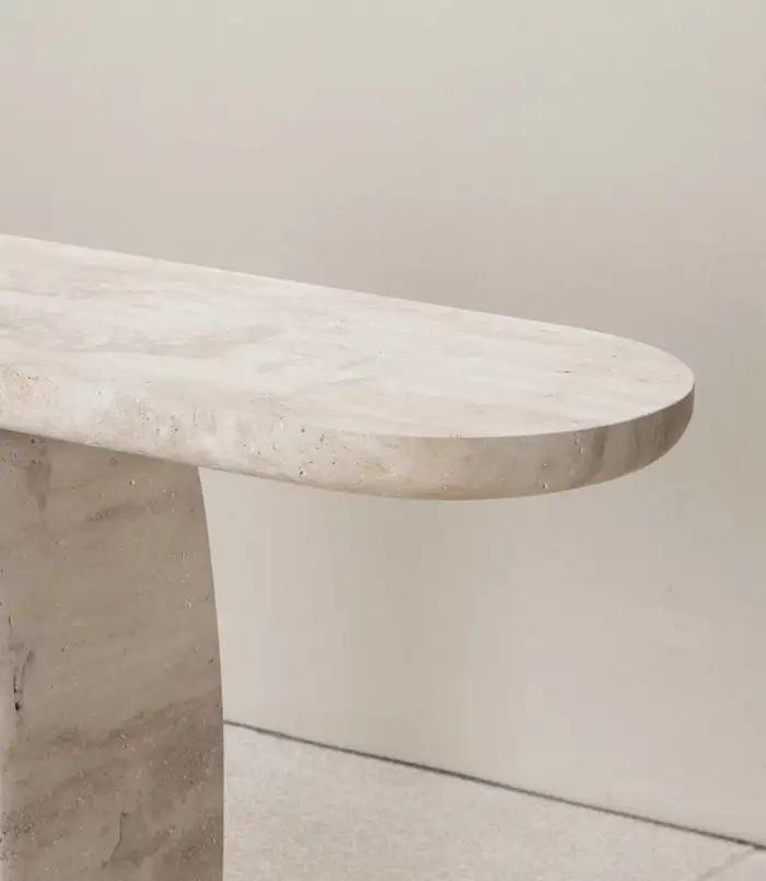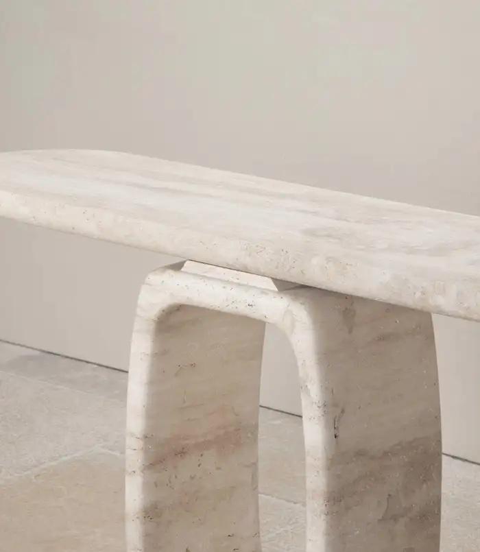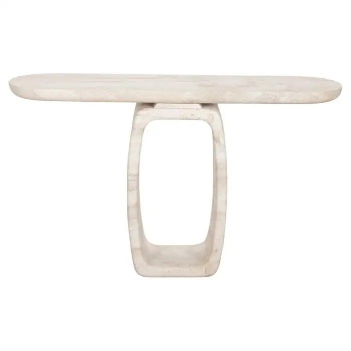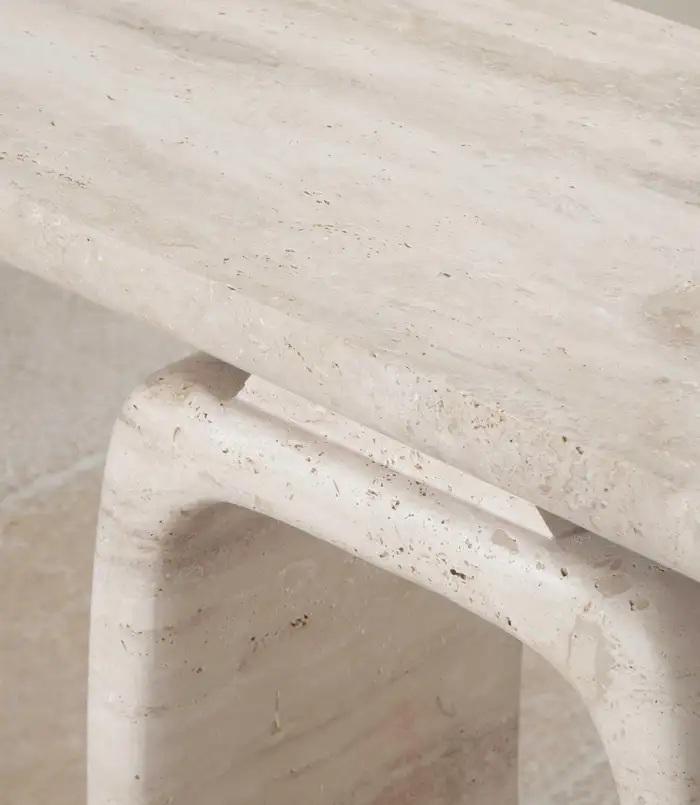 Table console en travertin artisanale avec base ouverte sculpturale, design moderne en pierre solide pour entrée et espaces de vie luxueux