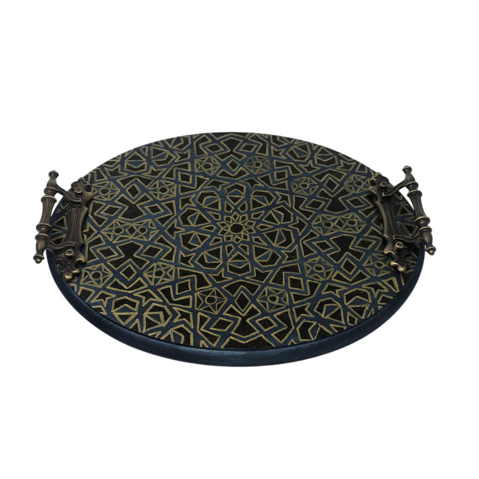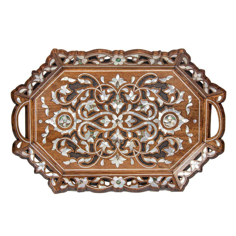 Plateau de service artisanal en bois de noyer avec incrustation de nacre, style ottoman marocain de luxe, avec poignées