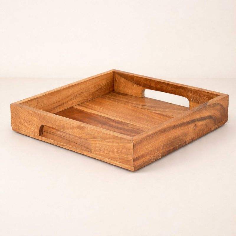 Plateau de rangement carré en bois artisanal avec bords surélevés, poignées découpées pour un transport facile, idéal pour la cuisine, la salle à manger, la table basse et la décoration intérieure