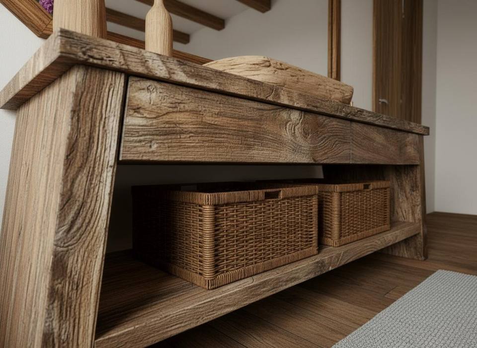 Meuble-lavabo de salle de bain en bois artisanal avec vasque en bois naturel, console en bois massif avec étagère de rangement pour la salle de bain à domicile