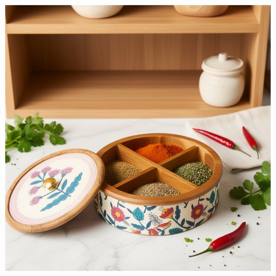 Boîte à chapati en bois artisanale avec organisateur d'épices, rangement de cuisine, conteneur à roti pour la décoration et l'organisation de la maison