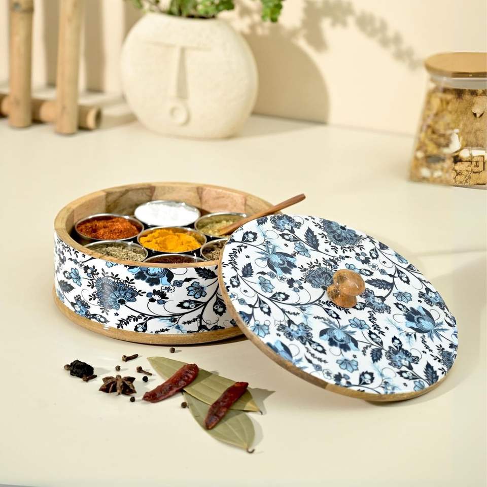 Boîte Masala en bois fabriquée à la main avec plusieurs sections pour le stockage des épices et des herbes dans la décoration de la cuisine