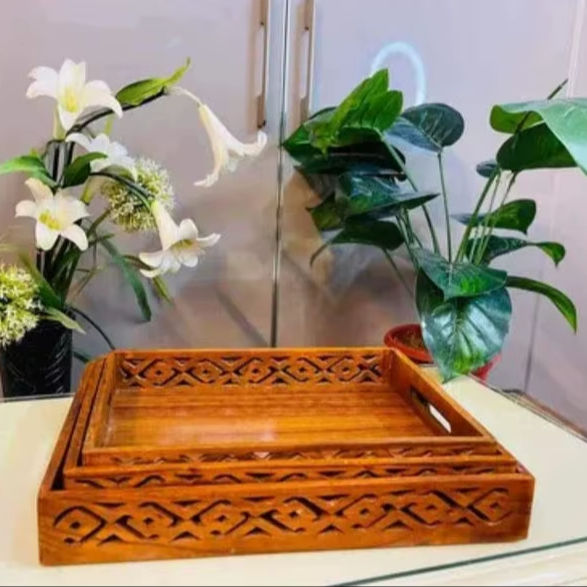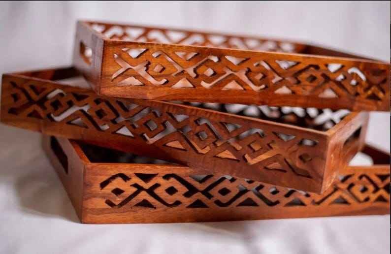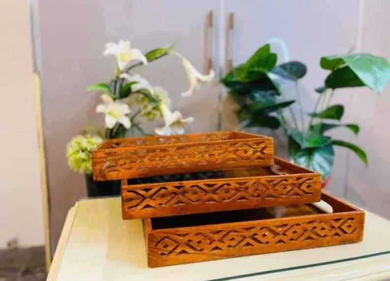 Ensemble de plateaux gigognes en bois faits à la main, décoration bohème et rustique, plateau de service, plateau en bois, décoration de mariage, plateau personnalisé