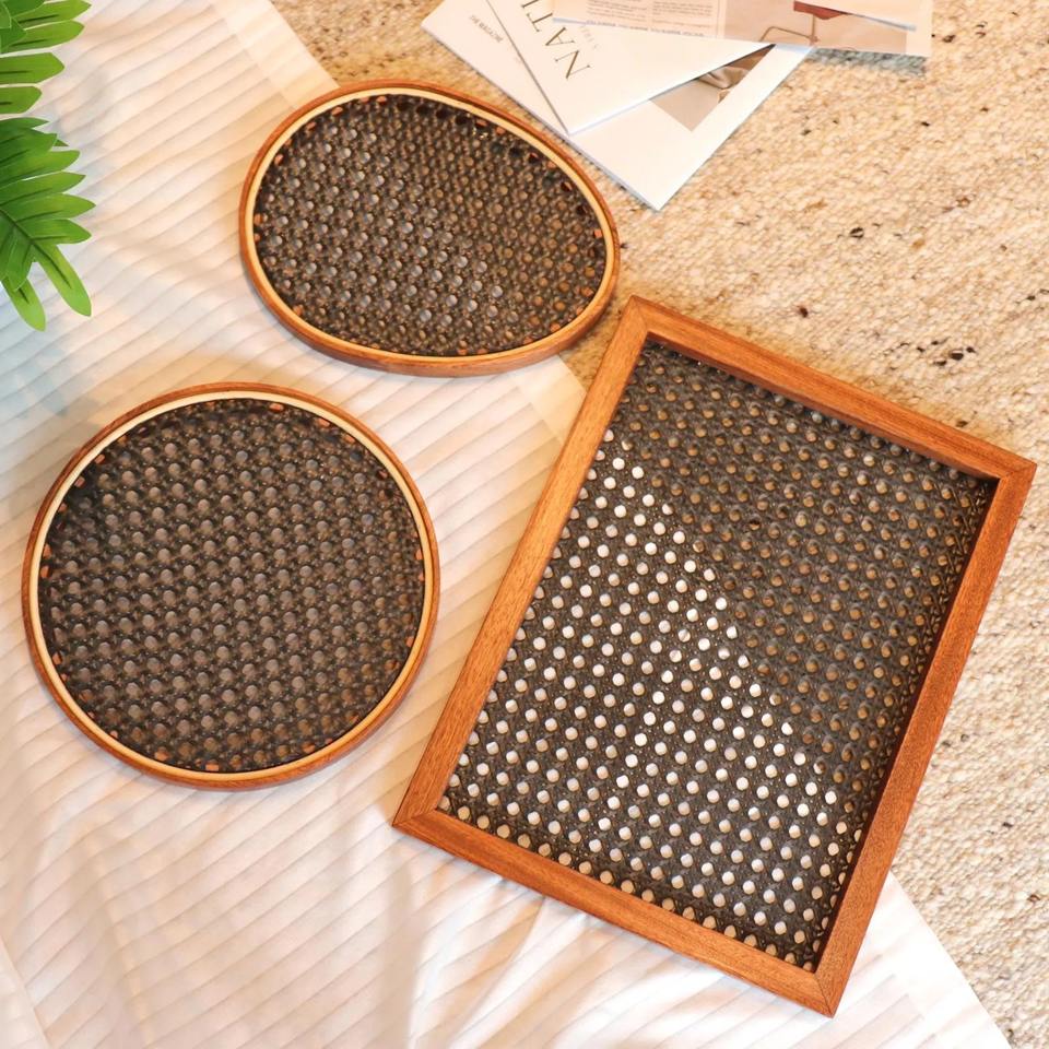 Ensemble de plateaux de service en rotin et bois faits à la main, ronds et rectangulaires, en cannage tressé, pour café, thé, collations, décoration de cuisine et de table