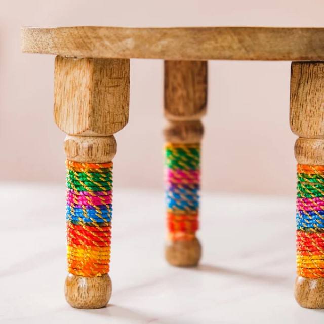Tabouret en bois fabriqué à la main Accent de jambe tissé coloré Table d'appoint ronde en bois de manguier avec pieds brodés Petit bois décoratif