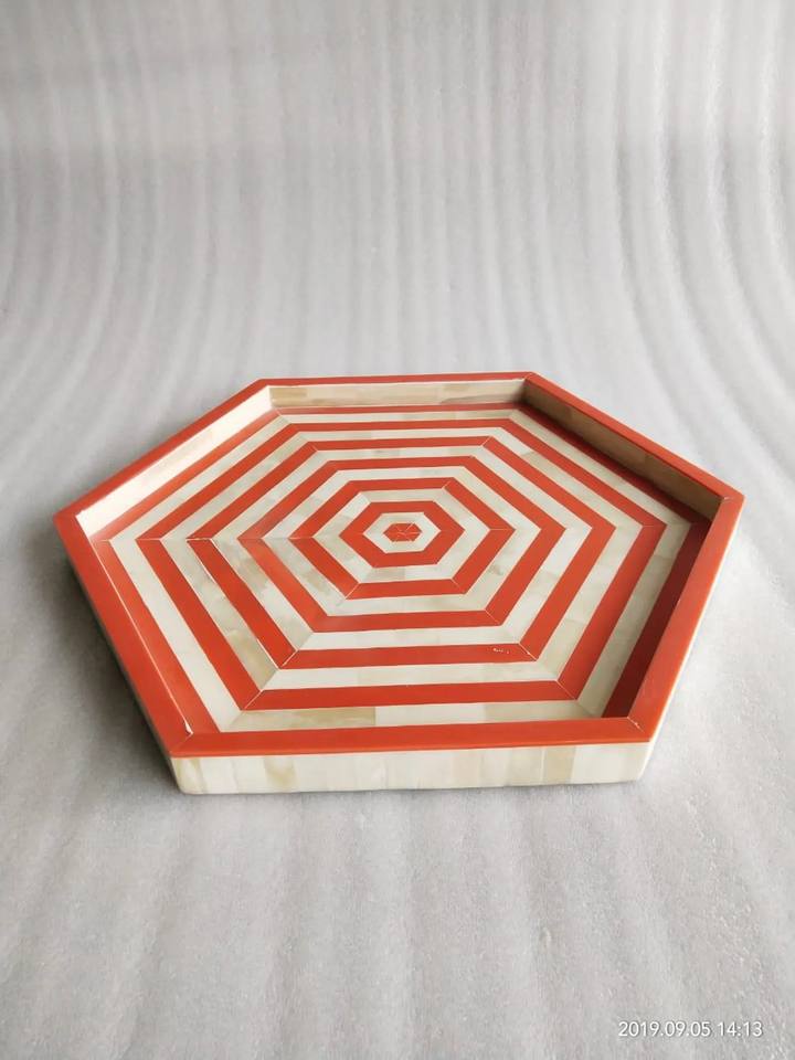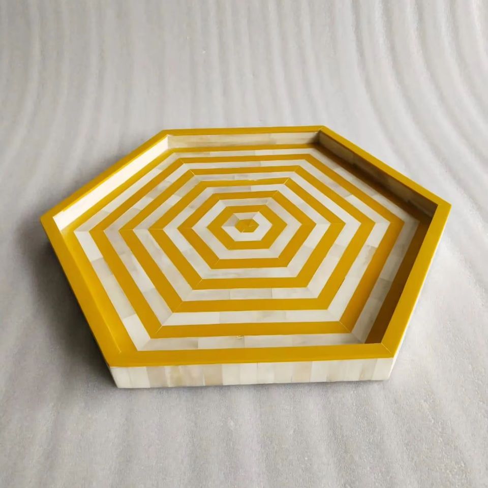 Plateau de service en bois hexagonal avec incrustation d'os floral jaune fabriqué à la main pour bureau, villa ou appartement de luxe, nouveau design