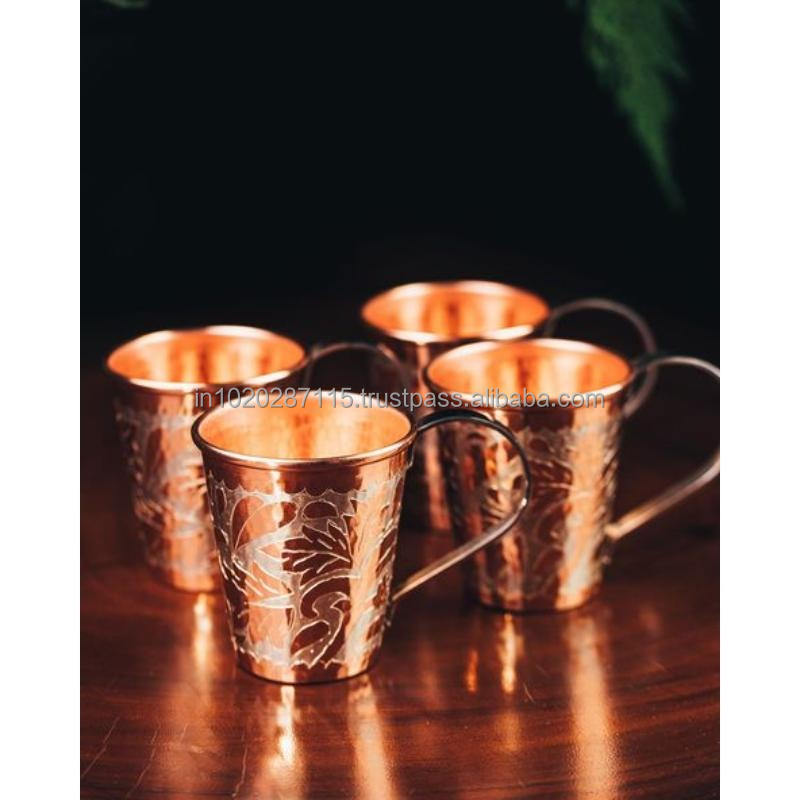 Tasses en cuivre fabriquées à la main avec une forme unique et une poignée élégante, idéales pour les cadeaux de vacances et les invités.