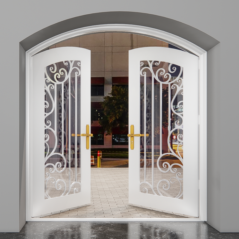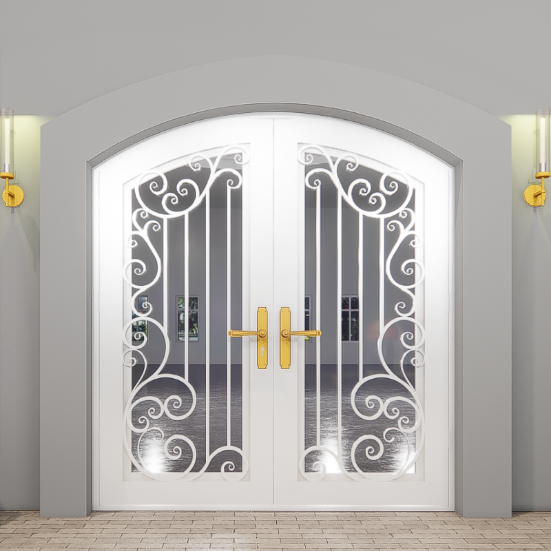 Porte d'entrée en fer artisanal avec défilement vertical et accents de verre pour les maisons traditionnelles et les entrées extérieures élégantes