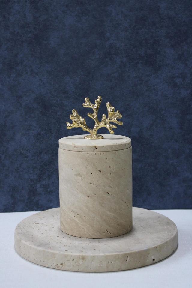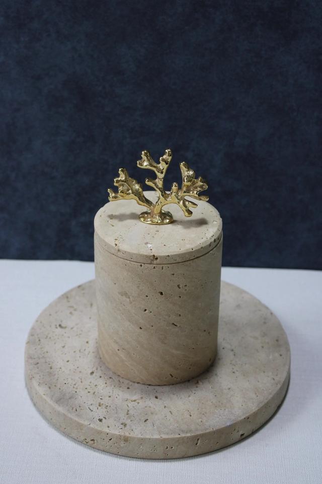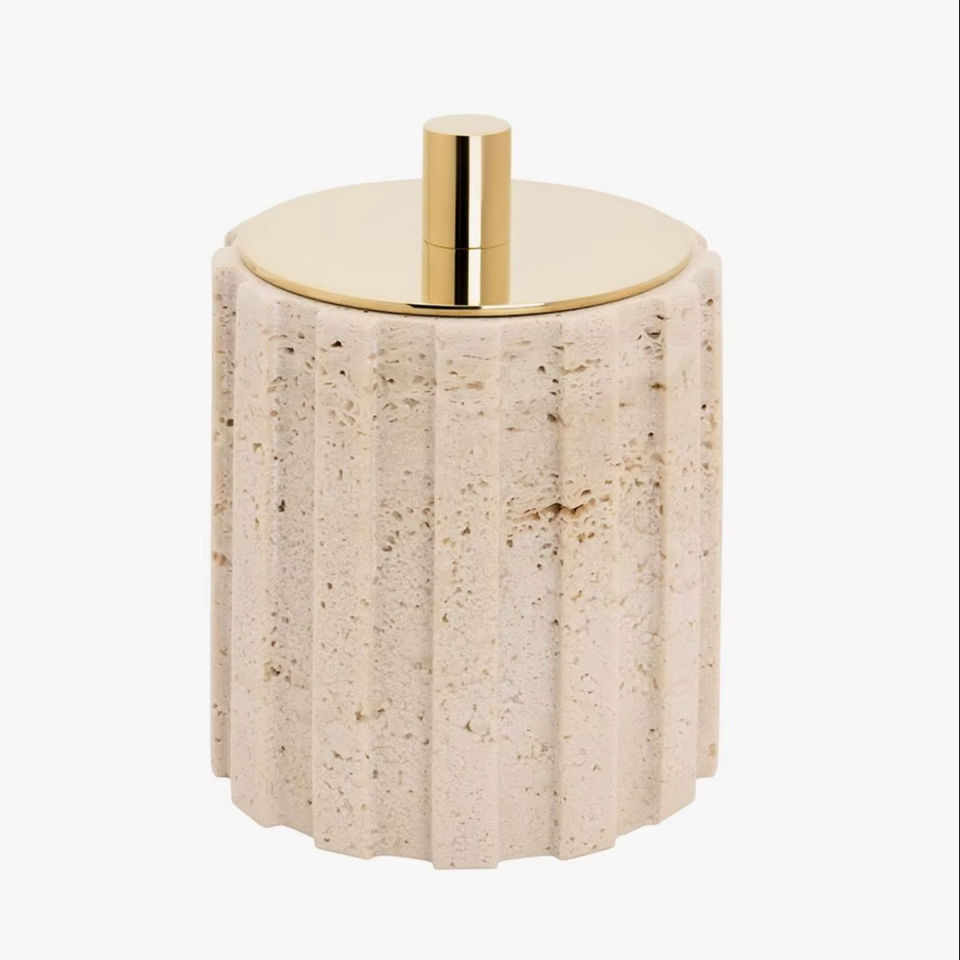 Boîte de rangement en travertin artisanale avec un design côtelé et un couvercle en or luxueux offrant une qualité durable et une élégance moderne pour la décoration de la maison