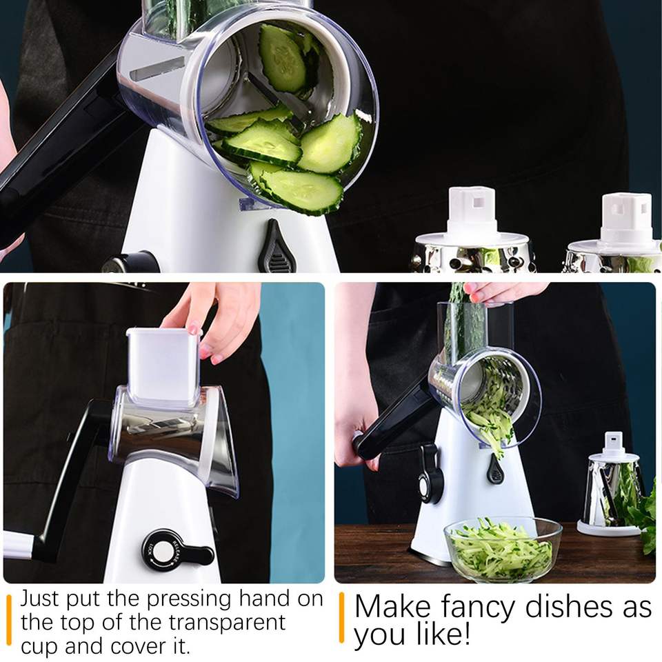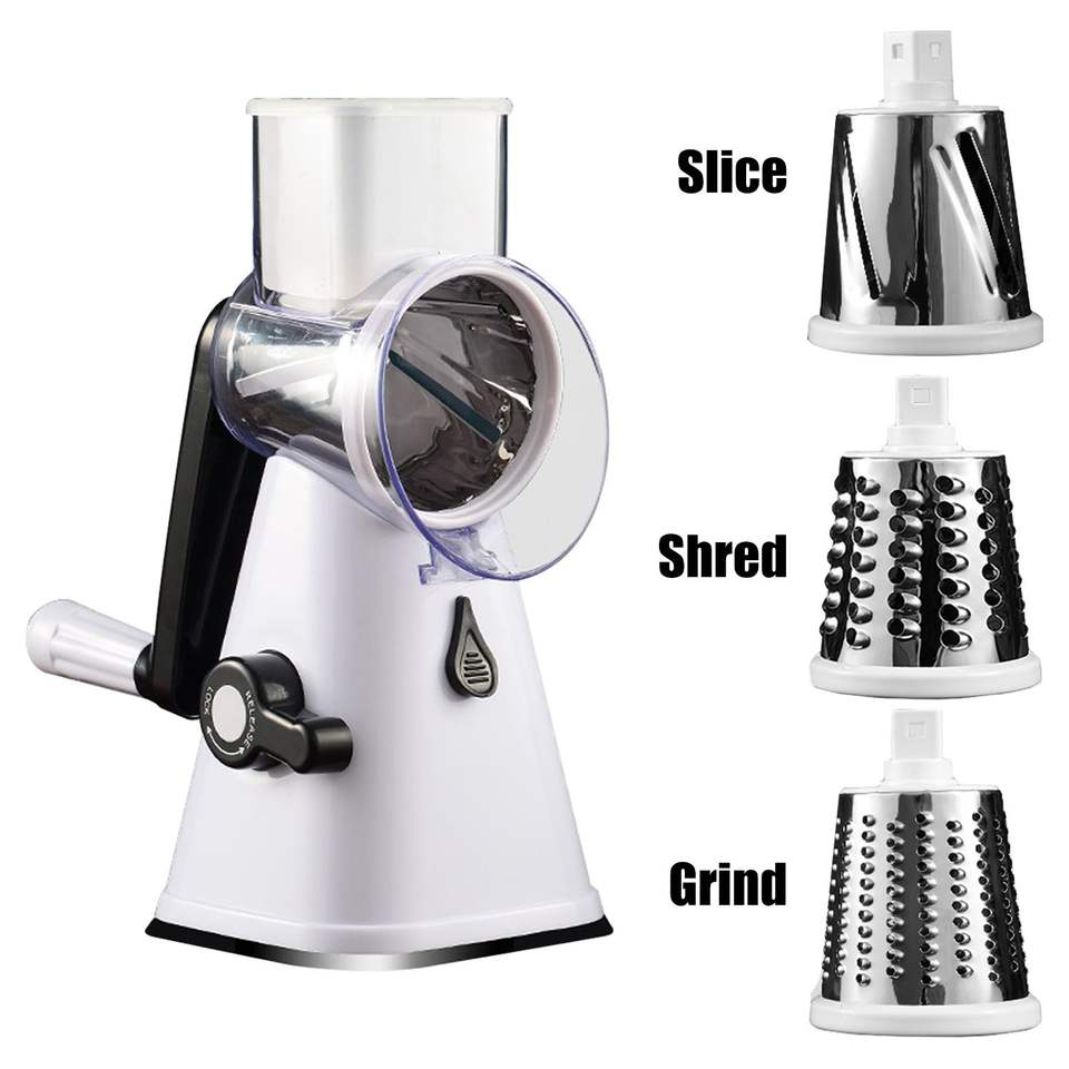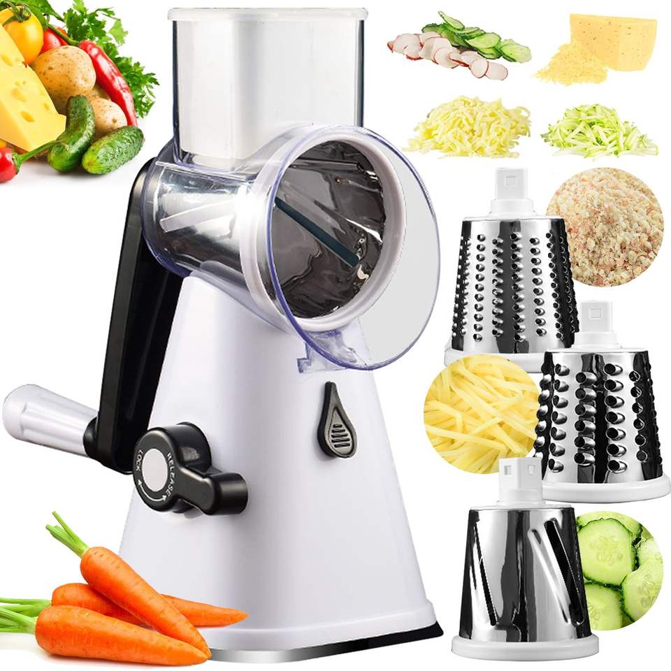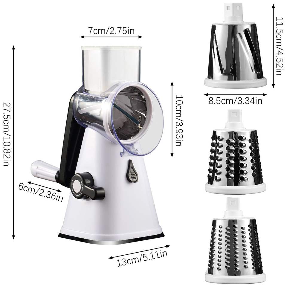 Râpe à fromage rotative manuelle avec 3 lames interchangeables en acier inoxydable, poignée pour râper le fromage, les fruits et les légumes