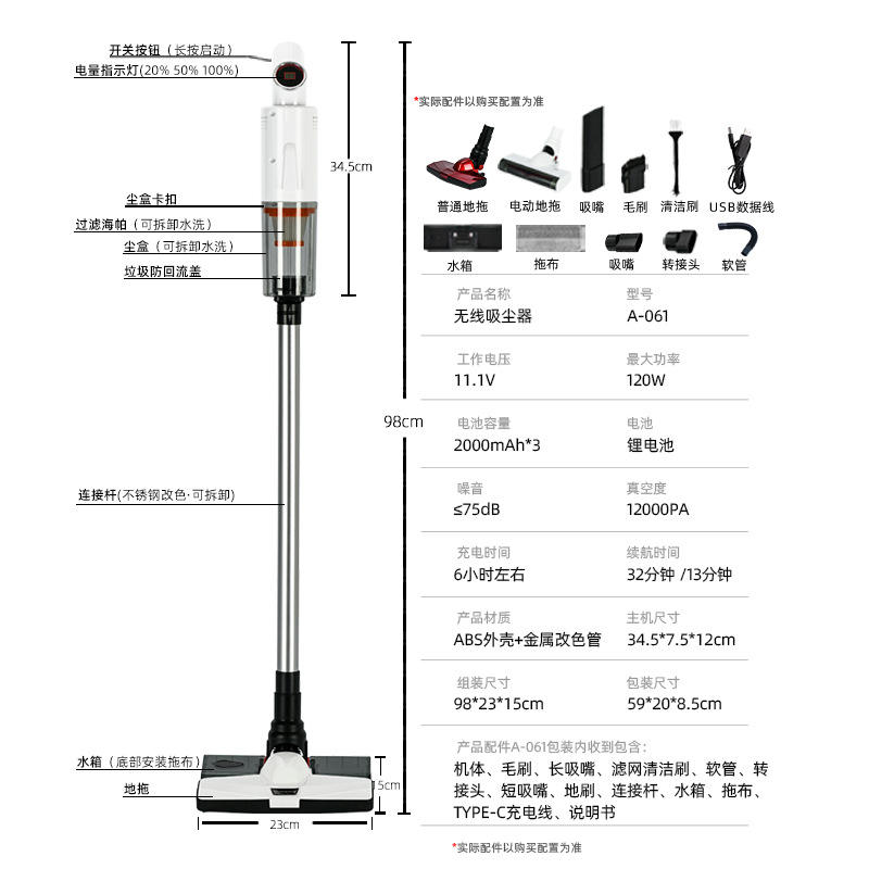 Aspirateur à main A-061 120W 2000mAh rechargeable pour nettoyage humide et sec, usage domestique