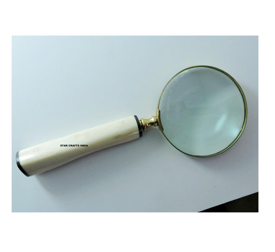 Loupe d'écran vintage à main en laiton massif avec lentille en verre optique et poignée en bois pour la lecture et la décoration artisanale