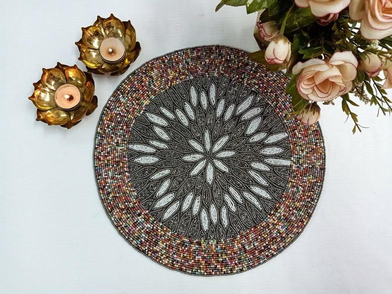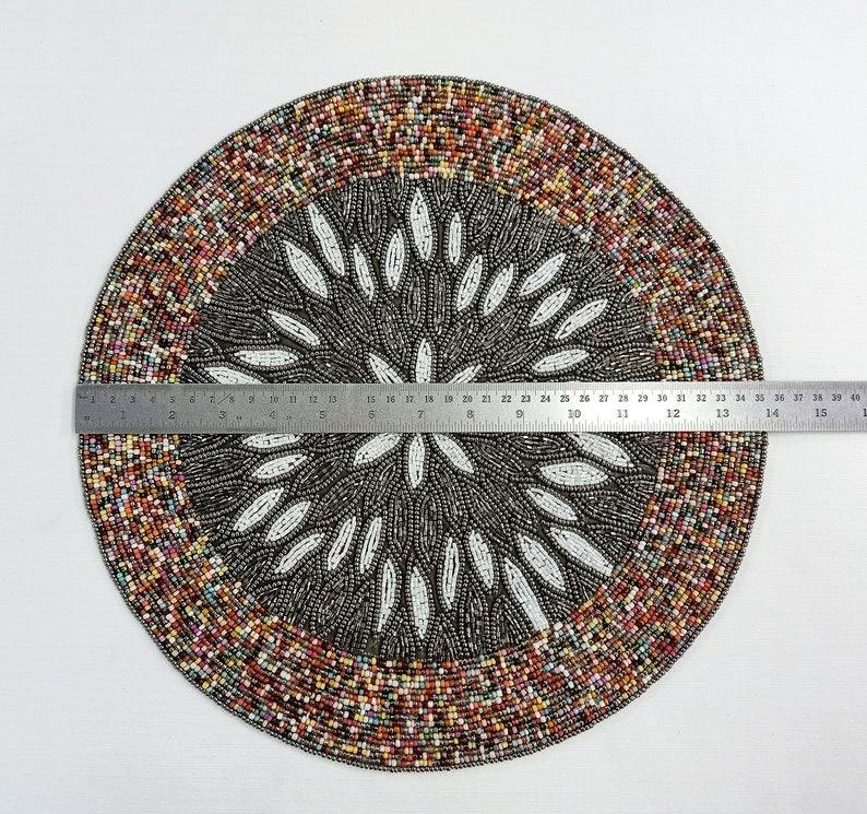 Ensemble de sets de table ronds en broderie artisanale de 14 pouces, argentés/dorés, avec motif ovale, écologiques, luxueux, pour mariage et dîner