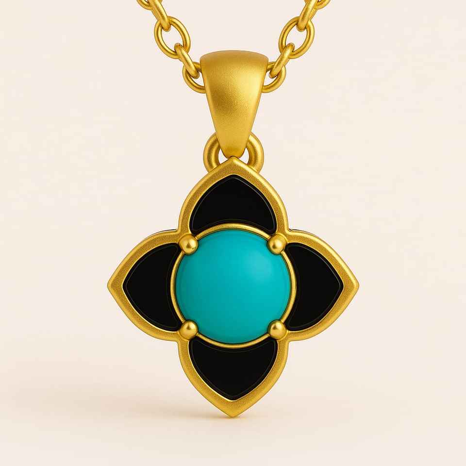 Pendentif en or jaune massif 14 carats Turquoise fait à la main en forme de fleur émail noir plaqué rhodium lunette pendentifs fins breloques