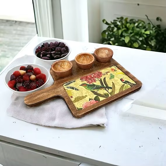 Handmade 15.5 X 10 Inch Mangowood Serving Dish Platter 3 Eco-Friendly Bird Design Bowl Color Enamel Technique for Cakes Snacks