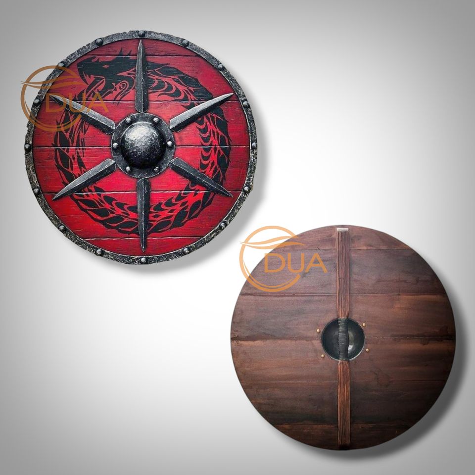 Bouclier rond viking en bois de guerrier rouge médiéval de 24 pouces fait à la main avec design de dragon style antique pour cosplay et décor
