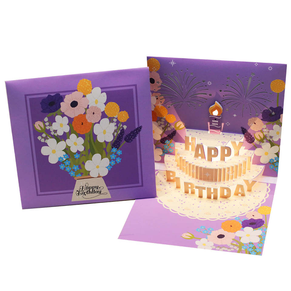 Carte de vœux 3D artisanale 'Joyeux Anniversaire' avec carte sonore et lumière LED intégrées, effet pop-up féerique